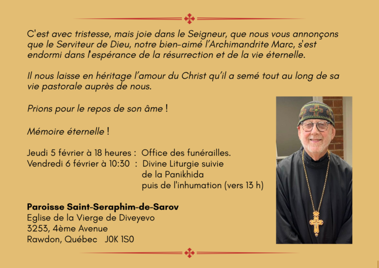 C’est avec tristesse, mais joie dans le Seigneur, que nous vous annonçons que le serviteur de Dieu, notre bien-aimé l’Archimandrite Marc, s’est endormi dans l’espérance de la résurrection et de la vie éternelle. Il nous laisse en héritage l’amour du…